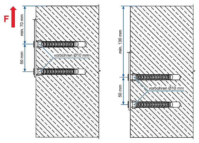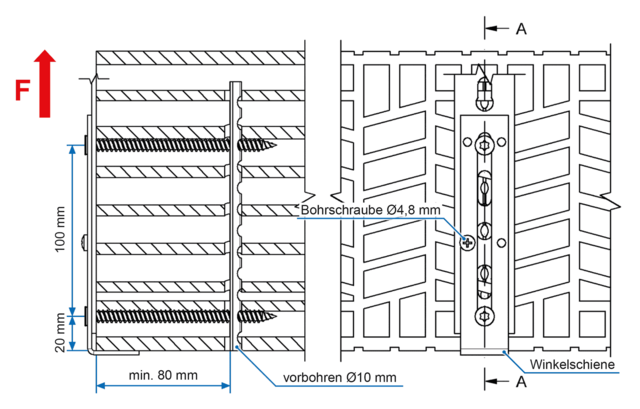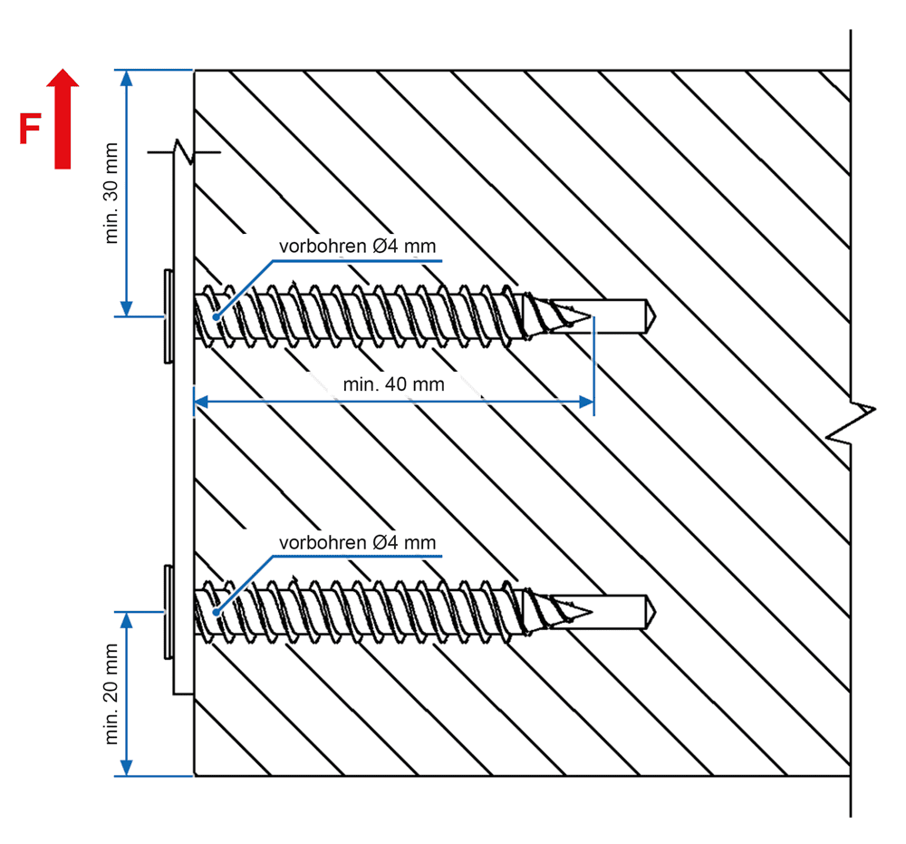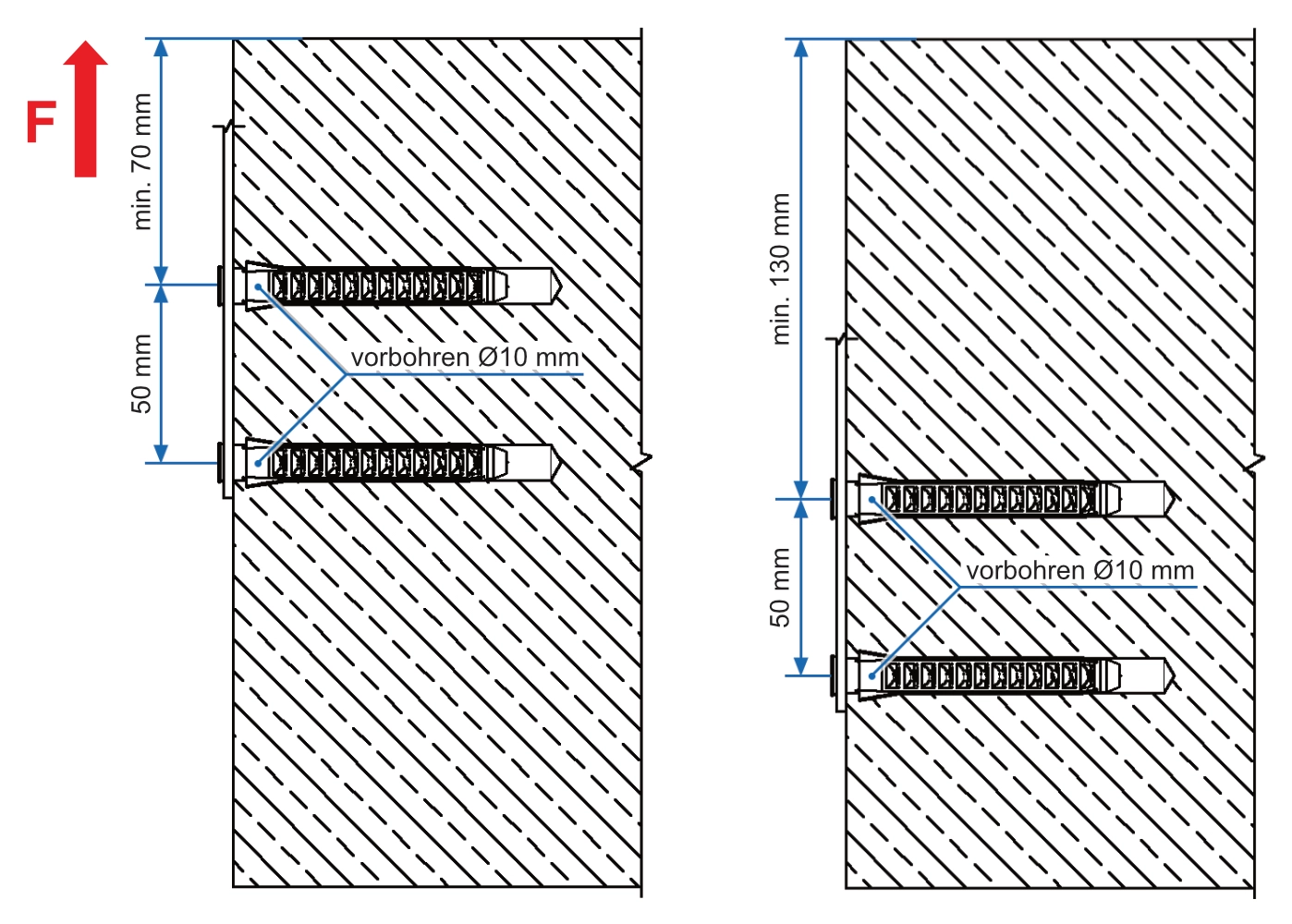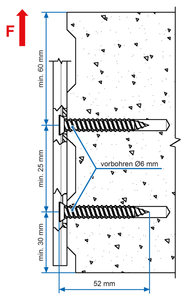 Für die Absturzsicherung ist eine Schraube ausreichend. Da wir hier von einer auskragenden Befestigung ausgehen, verwenden wir eine zweite Schraube für die Verklotzung.
